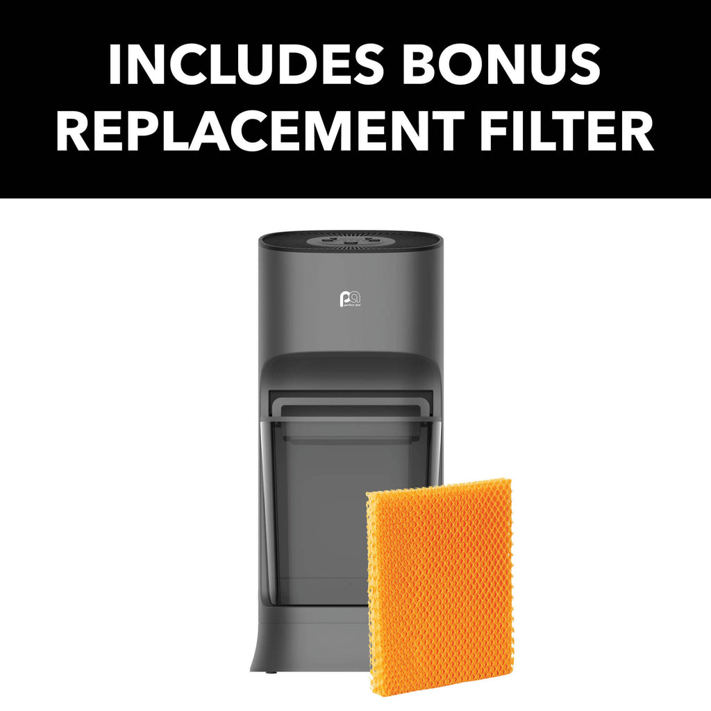 A healthier, more comfortable home starts with balanced humidity—and Perfect Aire makes it simple. This bundle includes the Perfect Aire 2.8-Gallon Evaporative Humidifier (1PAEC28) and a bonus replacement filter (PAEC3F), so you can enjoy fresher air right out of the box and keep it going longer with the included extra filter. With a generous 2.8-gallon capacity, this whole-room humidifier delivers up to 24 hours of continuous invisible cool mist, easing dry-air discomfort in bedrooms, offices, and larger living spaces. User-friendly digital controls let you customize output levels with ease, while the convenient top-fill tank offers two simple refill options without spills. A pre-installed wick filter, floor-standing design, and safety features like auto shut-off and a low-water indicator make this unit as practical as it is effective. With the added bonus filter, maintaining optimal humidity has never been easier or more convenient.